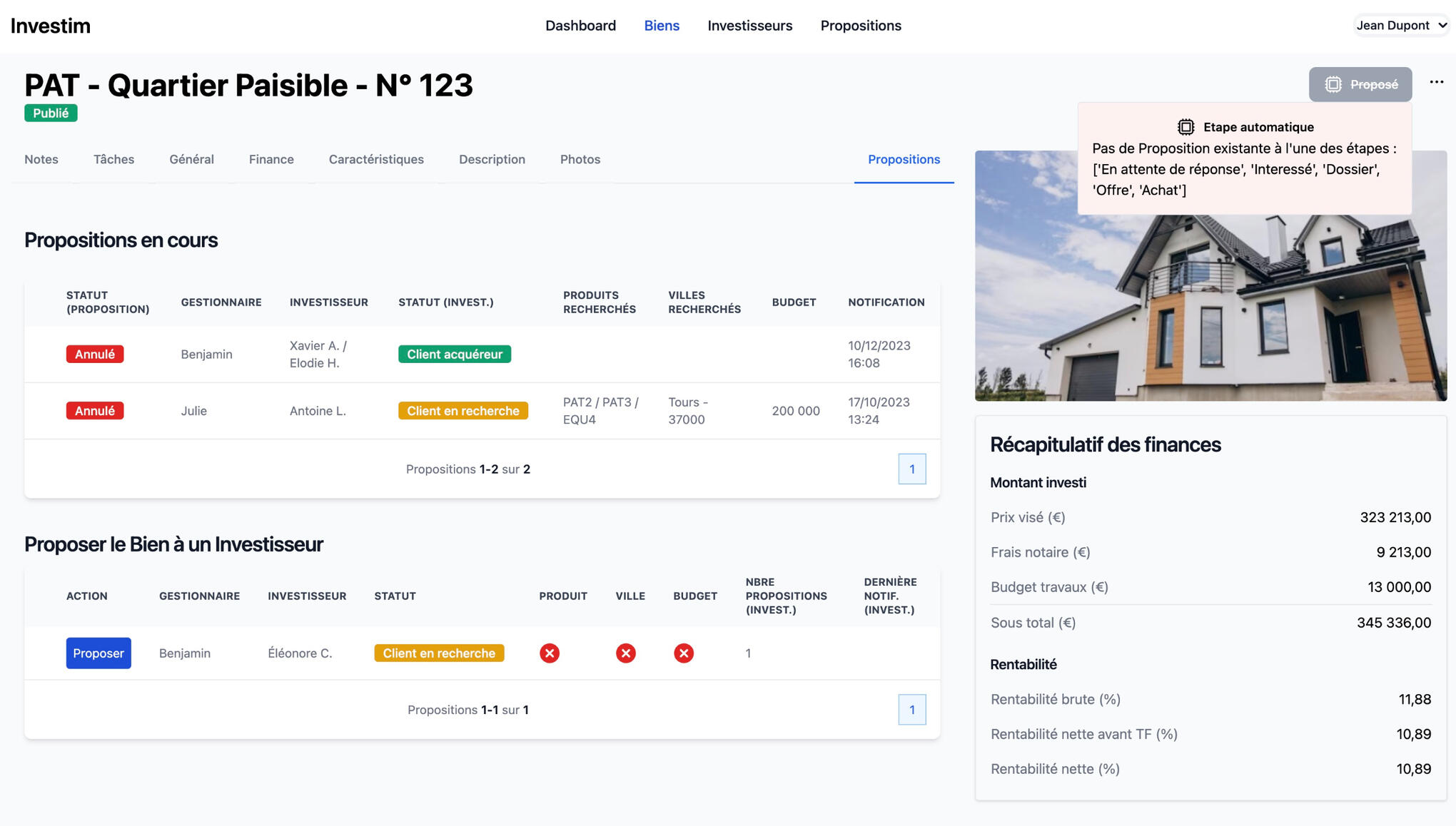 L’aide à la mise en relation vous permets d’identifiez les biens idéals pour chaque investisseur, de lui soumettre automatiquement une proposition digitalisée et personnalisée en le notifiant par email/SMS et de capter son retour sur la plateforme.