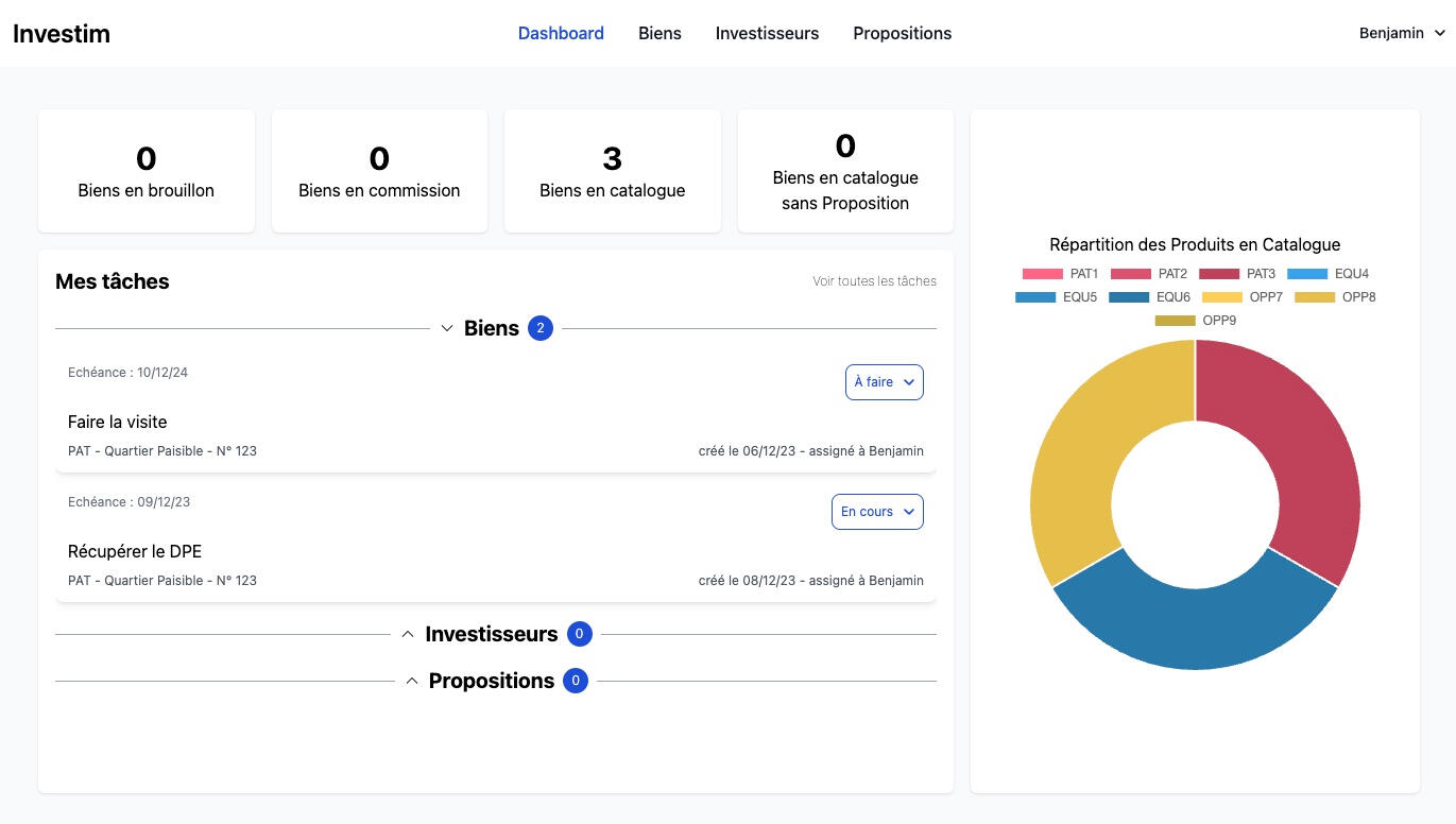 Investim est un outil SaaS conçu spécifiquement pour les conseillers en placement immobilier, visant à simplifier l’accompagnement des investissements. Il offre la possibilité de créer un catalogue personnalisé de biens, de suivre les investisseurs et de proposer des opérations adaptées à leurs besoins. Le conseil plus fluide et plus précis, favorisant ainsi des décisions d'investissement éclairées.